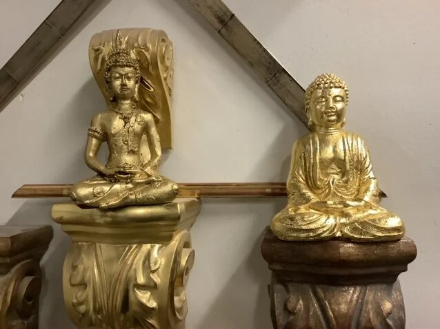 From the Charles Douglas Gilding Studio: Mordant Gilded Buddhas gilded during the Online Class Sacred Gilding…Gilding the Buddha which sit atop Traditionally Water Gilded Corbels in 23k gold leaf, the right corbel gilded over a custom-mixed crackle gesso.